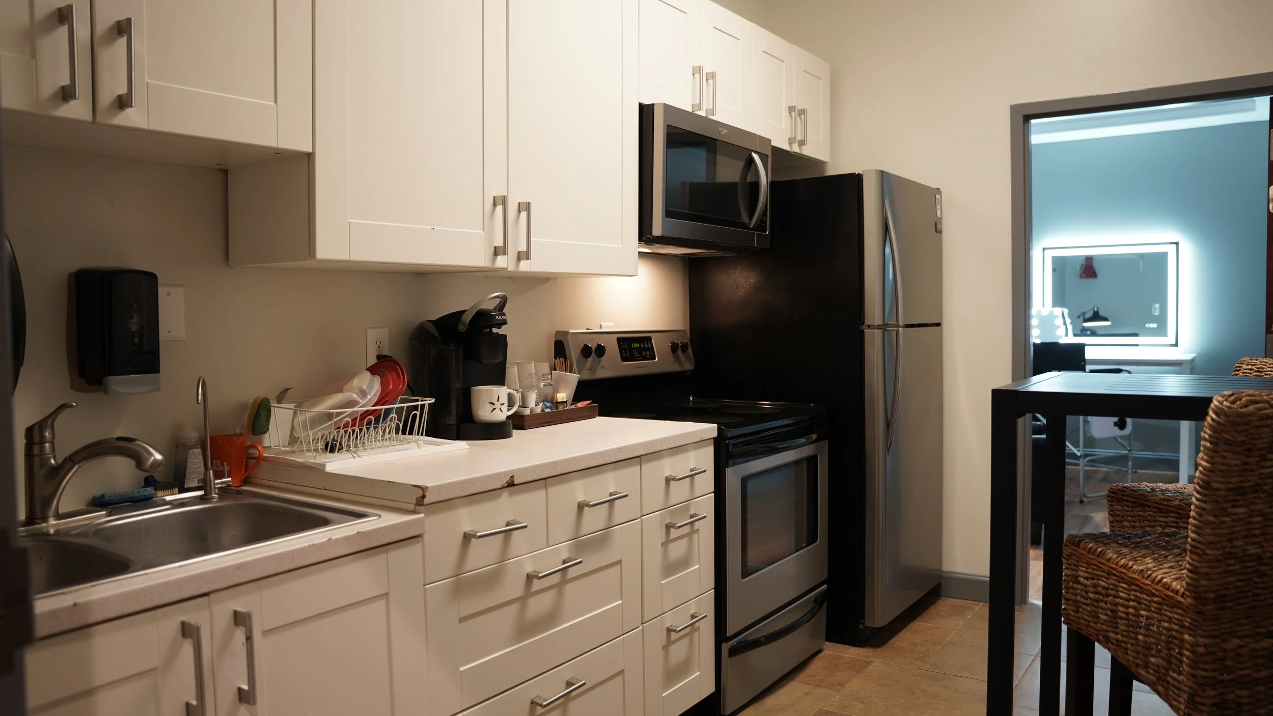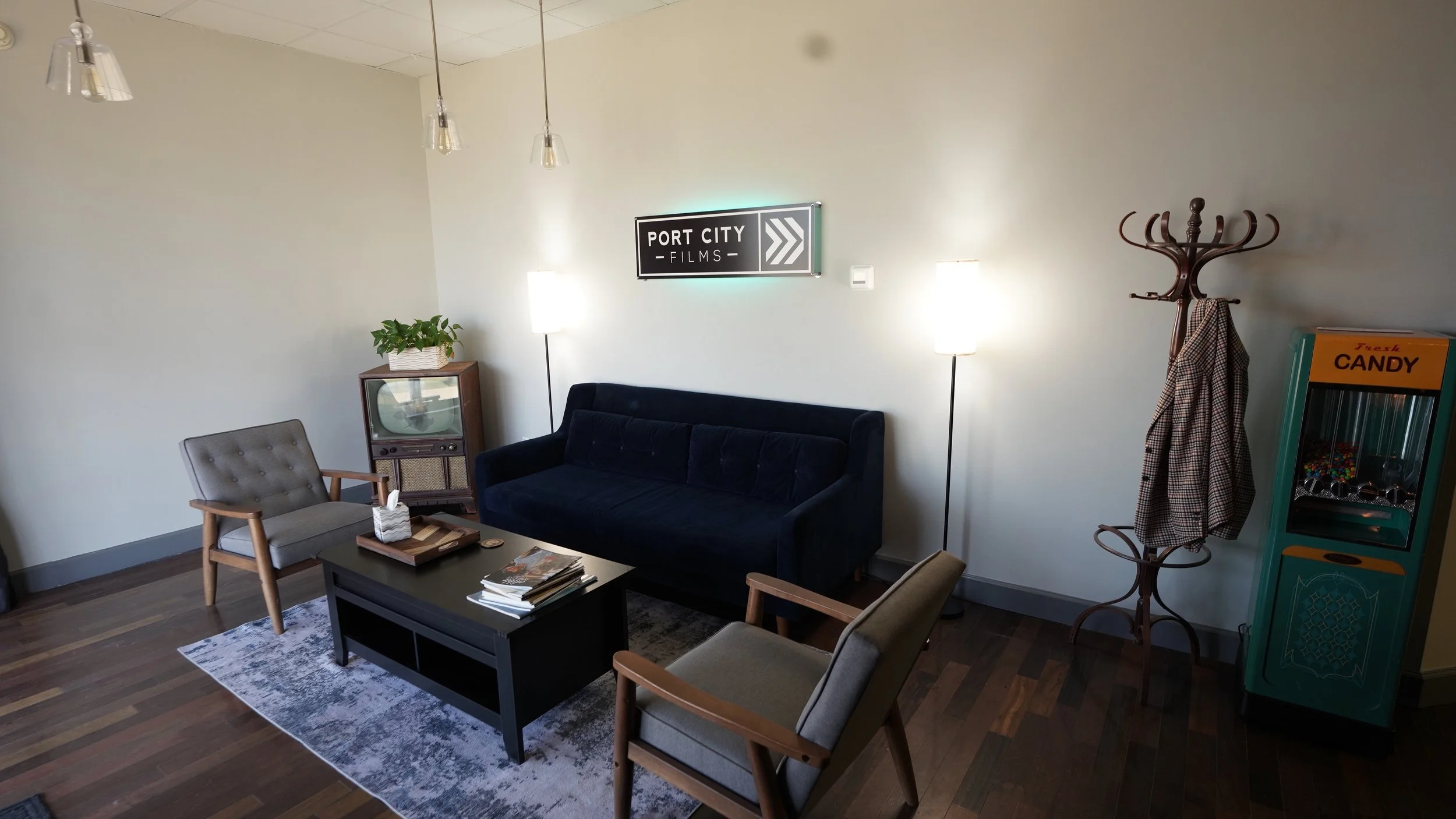 Our Wilmington, North Carolina studio includes an insulated and climate-controlled 2,500 sqft production studio space with 14-16ft ceilings, a 20x40ft lighting grid (12.5ft tall), a DIT/audio engineer room, a sound-treated recording booth, a hair and makeup/green room, editing suite, producer's office, general meeting spaces, and a full kitchen. This studio space is perfect for commercial, corporate, and independent film productions of all sizes.